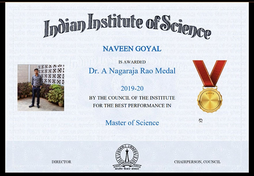Naveen receiving the Dr. A. Nagaraja Rao Gold medal (batch topper in Chem, Int. Ph. D, IISc) in virtual convocation - 2021