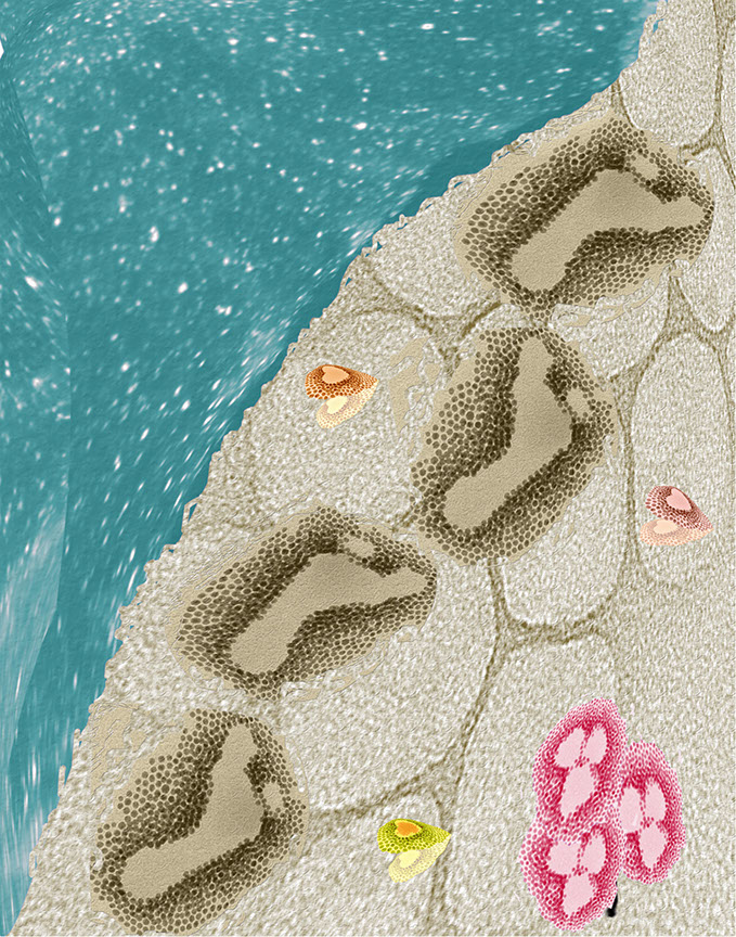 Nano-footprints on Seaside (false coloured TEM-image of Au nanoparticles), contributor: Paromita